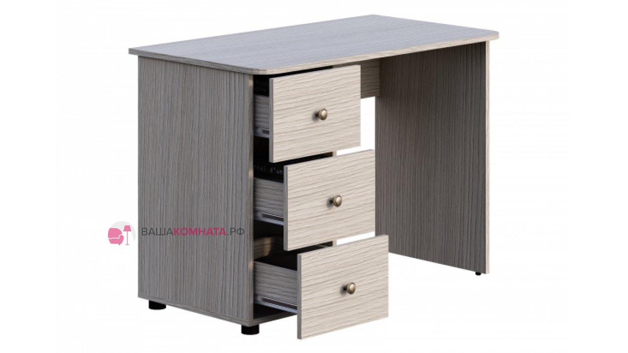 Стол письменный имеет секцию тремя выдвижными ящиками на шариковых направляющих длиной 400 мм. Ширина ящика внутри 249 мм. Высота боковины 106 мм. Ширина места для сидения 630 мм. Крышка стола имеет закругленные углы и закромлена спереди и с боков кромкой толщиной 2 мм. Задняя стенка и дно ящиков выполнена из ЛХДФ толщиной 3,2 мм. Фасадом являются фасады ящиков. Максимальная нагрузка на ящики – до 8 кг. Опоры-американки и опоры М6. Высота регулировки до 10 мм.