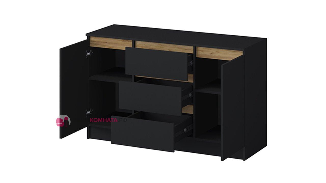 Отличительной чертой данного комода является цвет. Мебель в черном цвете в сочетании с натуральным оттенком древесины "дуб крафт золотой" представляет собой удивительный баланс контраста и гармонии. Черный добавляет интерьеру строгого шика и роскоши, подчеркивая благородство древесной структуры дуба, которая выражена теплым золотистым оттенком. Такая комбинация выглядит изысканно и дорого, прекрасно вписываясь в современные стили интерьера, такие как минимализм, лофт или скандинавский дизайн.