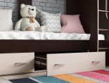 Кровать оснащена выкатными ящиками. Глубина ящиков по боковине 600 мм, ширина по фасаду 785 мм, выкатываются ящики на колесных опорах.