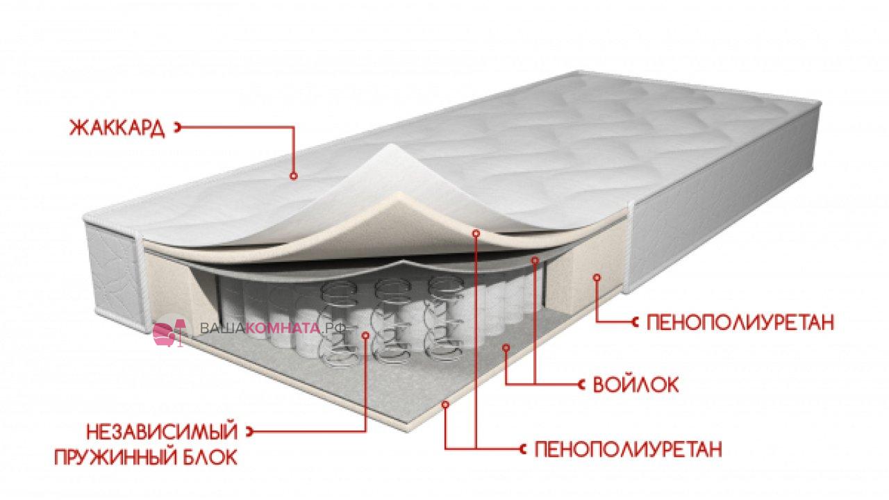 Состав: Ткань жаккард стег. на 100 г синтепона, ППУ 2см, термовойлок, независимый пружинный блок 256, ППУ отбартовка усиленная.