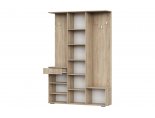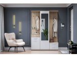 Прихожая визуально состоит из нескольких элементов. Слева тумба со щитом шириной 450 мм. Тумба высотой 786 мм состоит из выдвижного ящика и секции с распашной створкой. Внутри секции устанавливаются две съемных полки. Щит высотой 1168 мм комплектуется двумя крючками для одежды. Посередине располагается пенал шириной 450 мм. Пенал комплектуется распашной створкой, внутри устанавливаются пять съемных полок. Справа обувница со щитом шириной 450 мм. Обувница высотой 370 мм комплектуется распашной створкой. Щит высотой 1584 мм комплектуется тремя крючками для одежды. Все элементы объединены общей крышкой, выполняющей роль открытой полки.