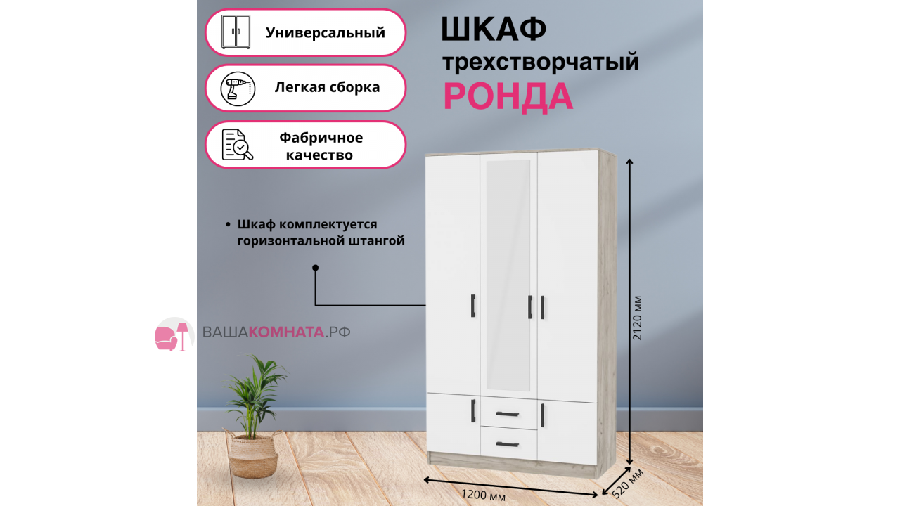 Шкаф 3-створчатый ШК-3 "РОНДА" - современные решения для интерьера вашего дома.