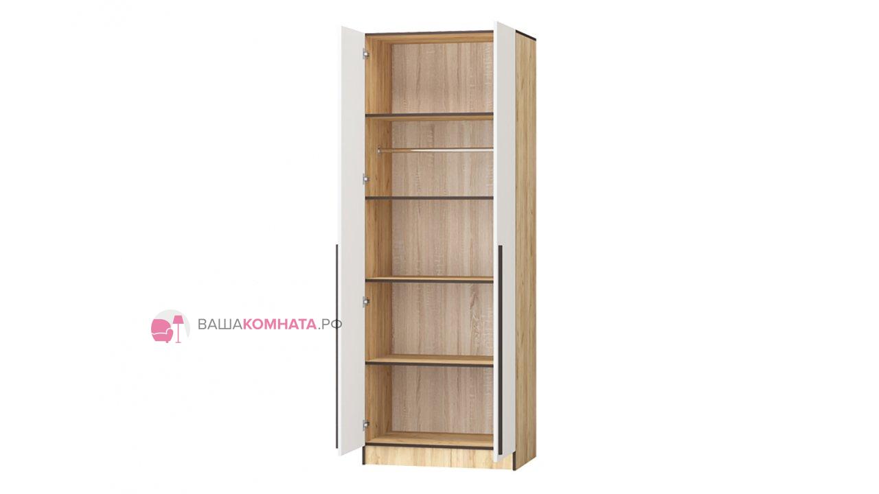 За двумя распашными дверями шкафа расположены четыре полки, на которых можно разместить сложенную одежду, постельное и нижнее белье, разнообразные аксессуары и коробки с обувью. Это обеспечивает удобное и практичное использование пространства.