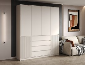 За двумя центральными дверьми находится широкая штанга для вешалок-плечиков с верхней одеждой, деловыми костюмами, красивыми платьями и другой одеждой. Полки, скрытые за боковыми дверьми, пригодятся для сложенной одежды, постельного и нижнего белья, разнообразных аксессуаров и коробок с обувью.