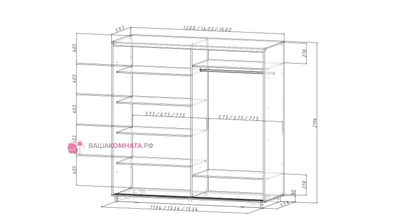 Шкафы имеют секцию для одежды со штангой и секцию с полками.