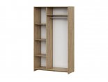 Шкаф комплектуется створками разной ширины. По краям створки шириной 413 мм, средняя створка — 328 мм. Шкаф разделен вертикальной перегородкой на две секции: бельевую и платяную. В левой бельевой секции шириной 418 мм располагаются 2 съемных и 1 стационарная полки. В правой платяной секции шириной 734 мм располагаются стационарная полка вверху и металлическая штанга. В комплектацию шкафа входят два зеркала 200х901 мм. которые приклеиваются на центральную створку при сборке.