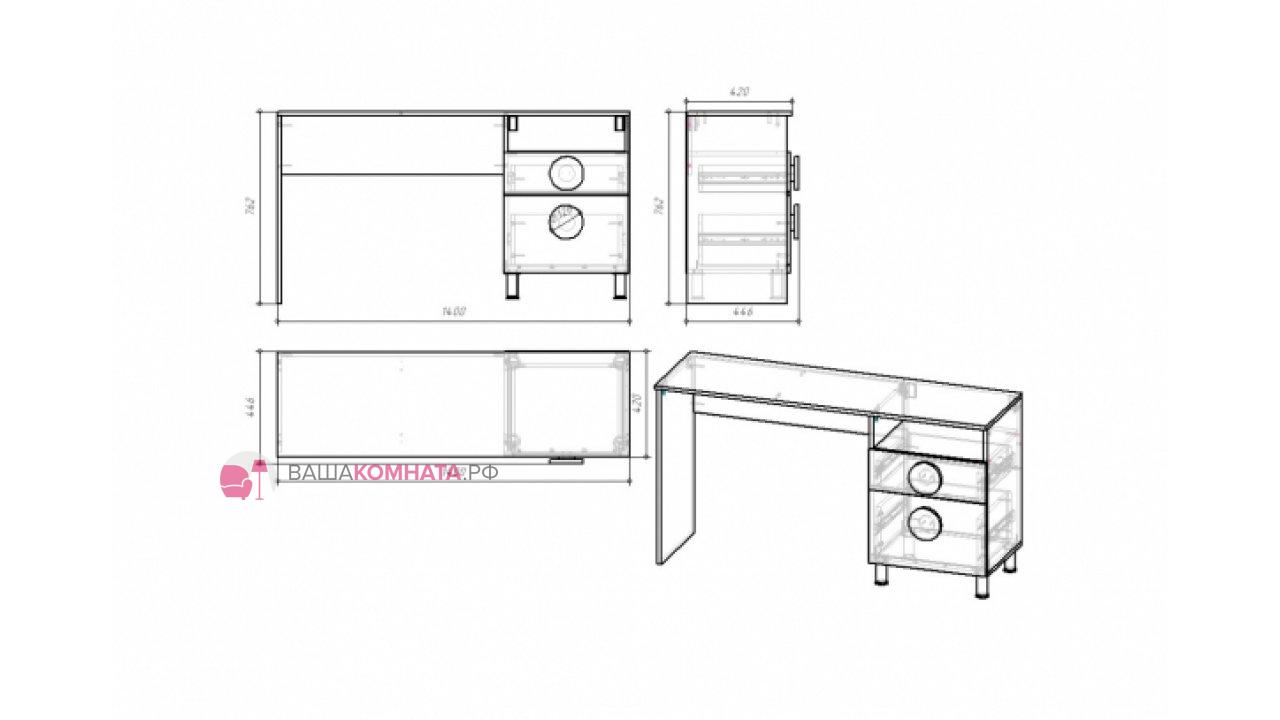Стол письменный СП-001 имеет два удобных и вместительных ящика. Полезная площадь ящиков 410 х 334 мм,высота по боку верхнего ящика 106мм,высота по боку нижнего ящика 202 мм.