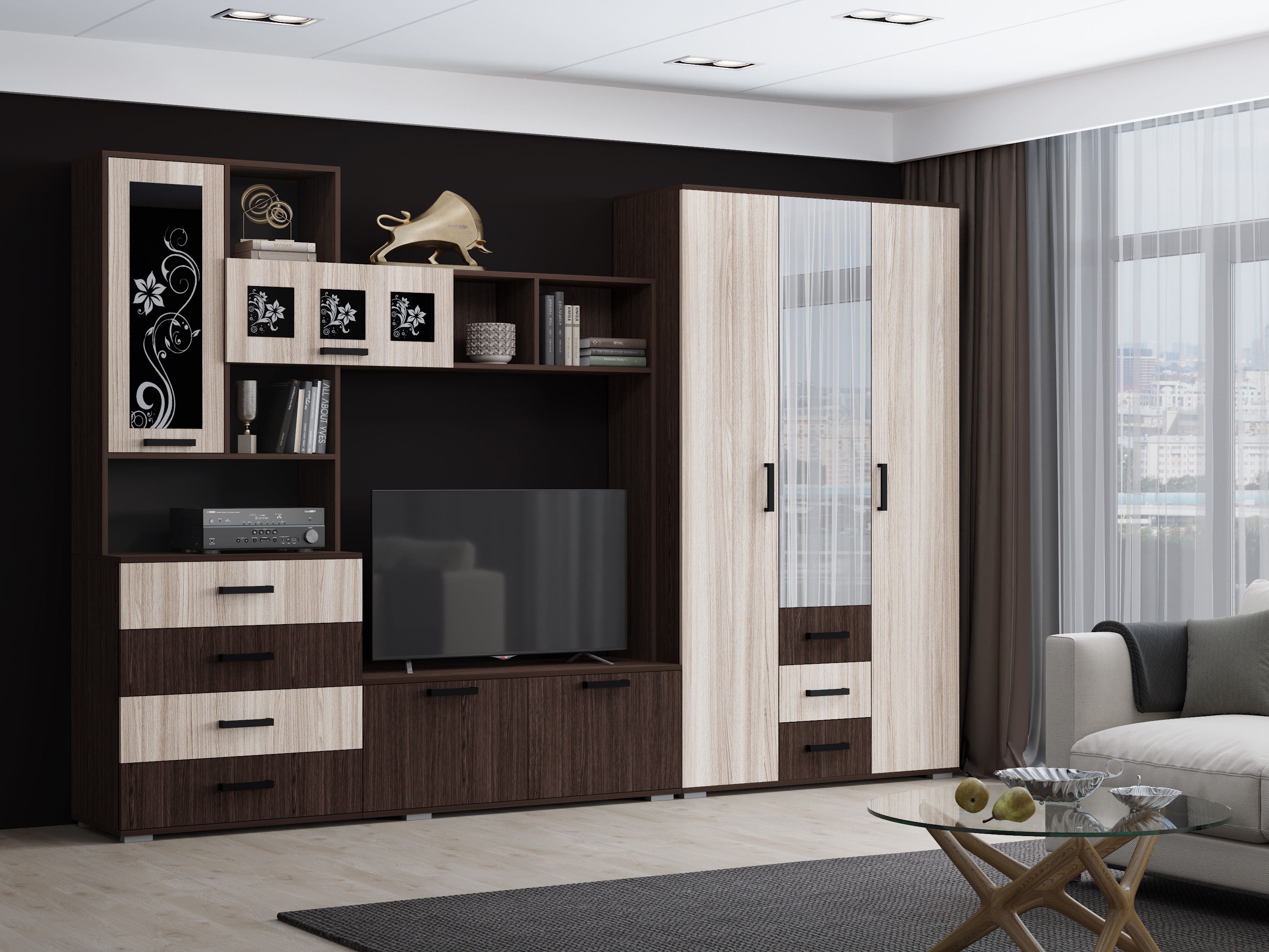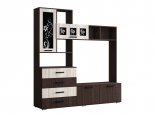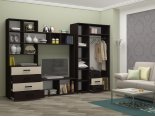 Оснащена комодом, тумбой под ТВ, стеклостворкой под книги или посуду и полками под различные мелочи.