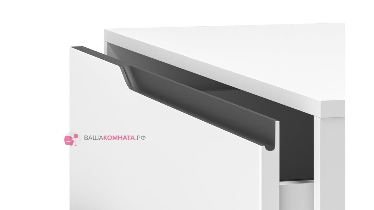Корпус тумбы гладкого белого цвета, создает ощущение легкости и чистоты, визуально расширяя пространство. Гладкая матовая поверхность приятна на ощупь и устойчива к мелким повреждениям, что обеспечивает долгий срок службы изделия.