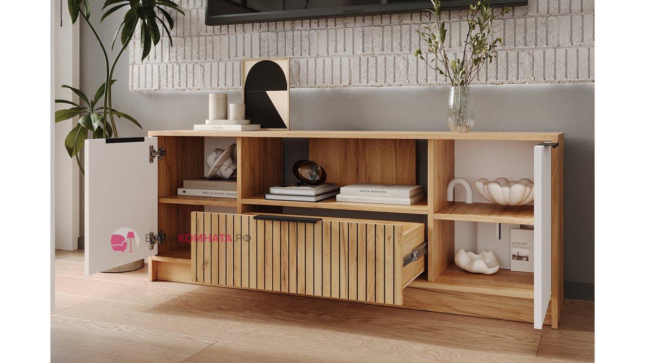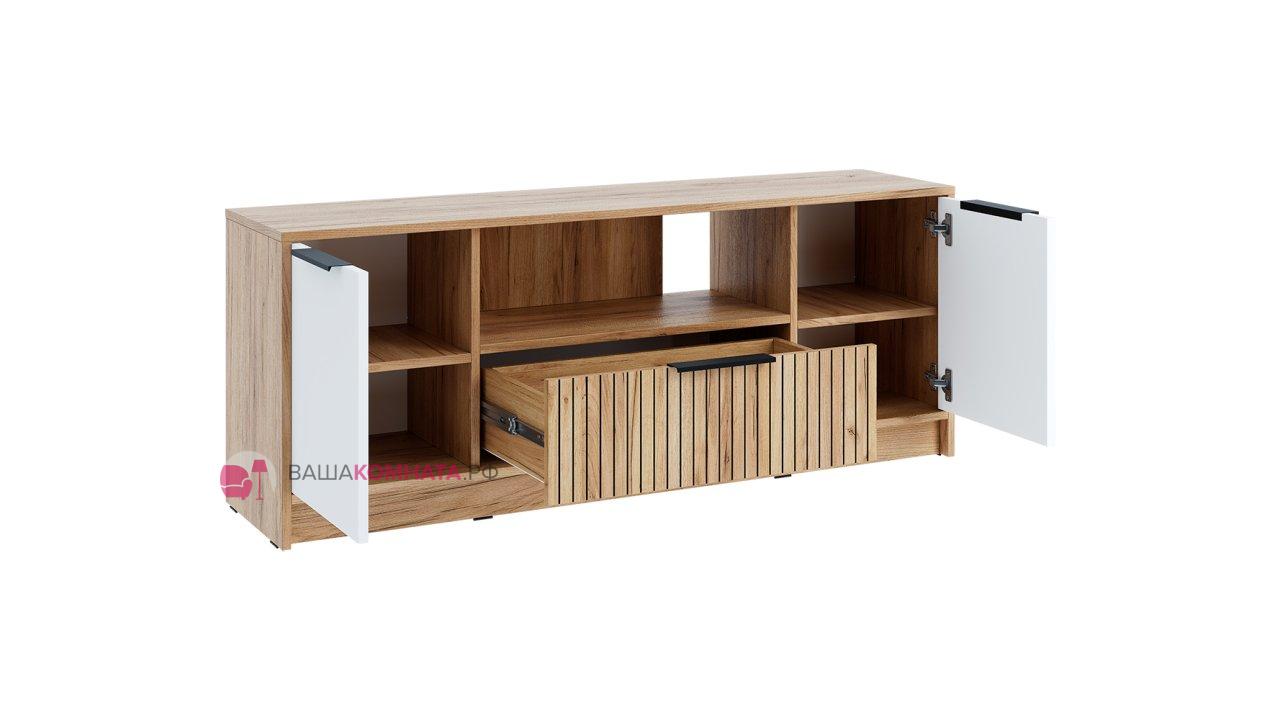 Тумба "Ивис" ТМ-001 создана для организации современной гостиной: в ней найдется место для телевизора, медиаприставок и множества мелочей.