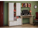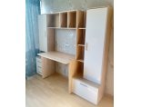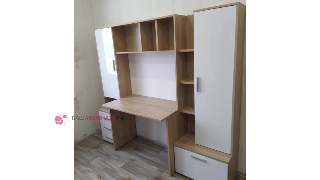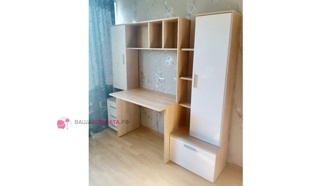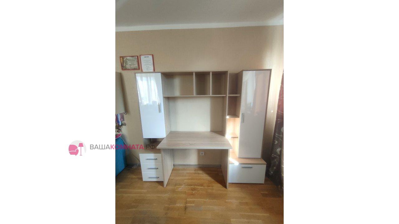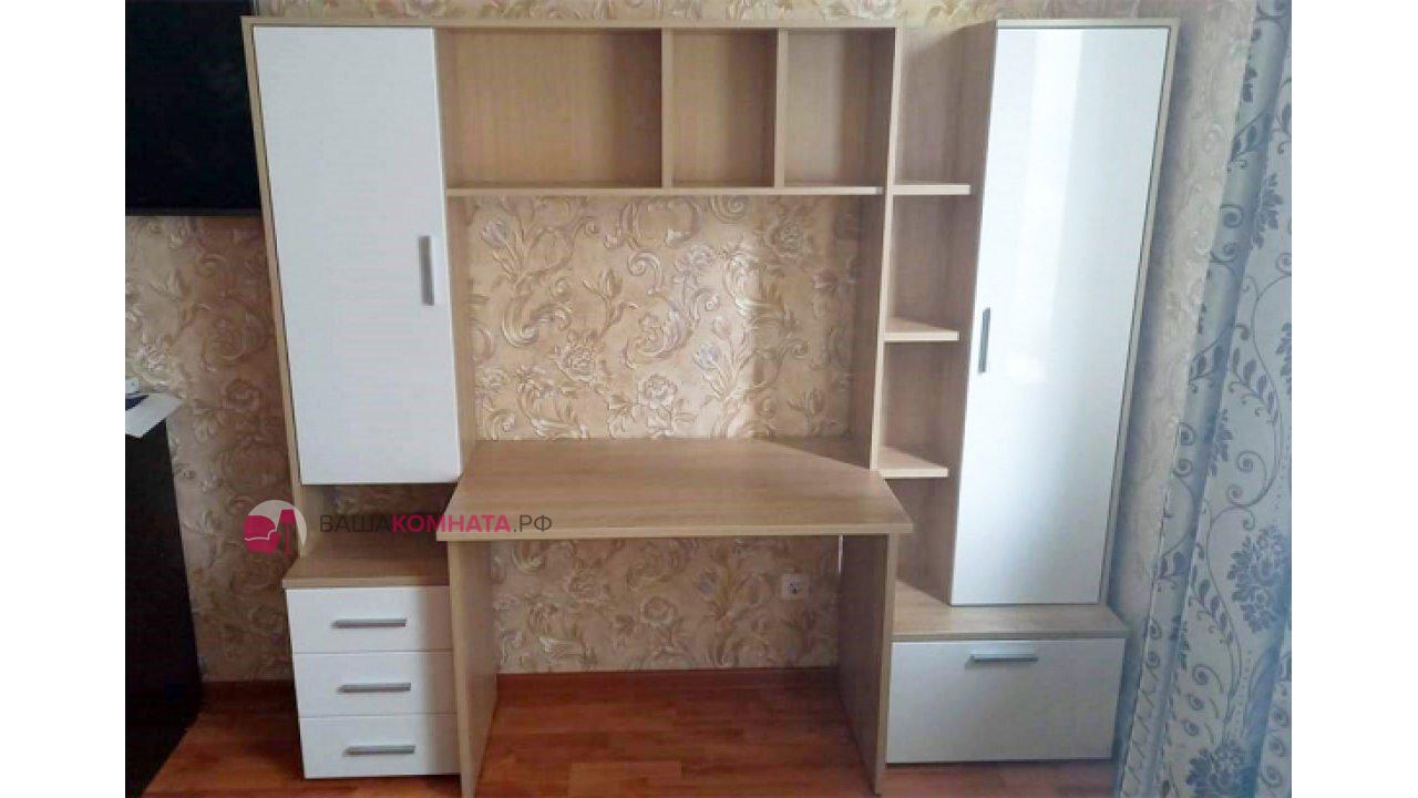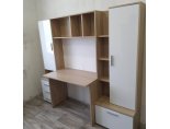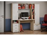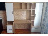 -Рабочий стол размером Д.1000 х В.755 х Г.590 мм. , открытых полок над ним и присоединённого к нему небольшого пенала шириной 400мм. состоящего из тумбы с 3мя выдвижными ящиками и невысокой открытой нишей и закрытым створкой отделением над ней.