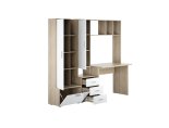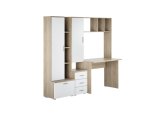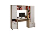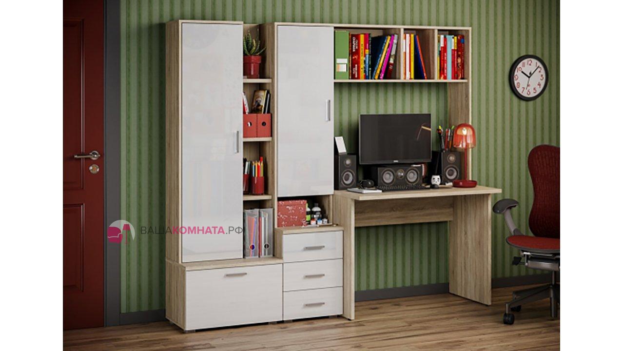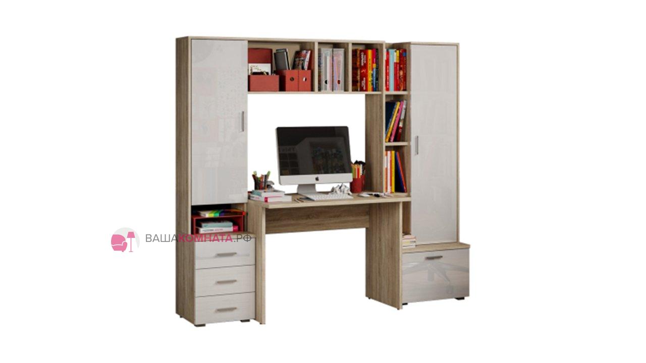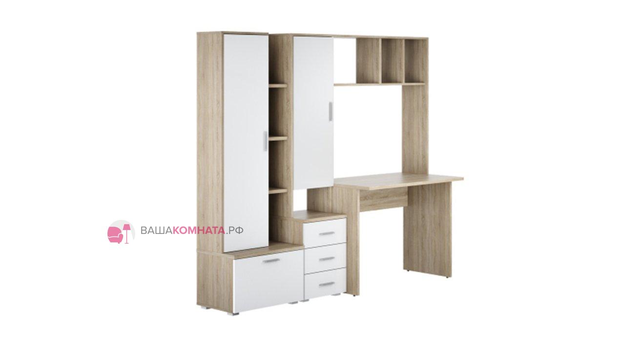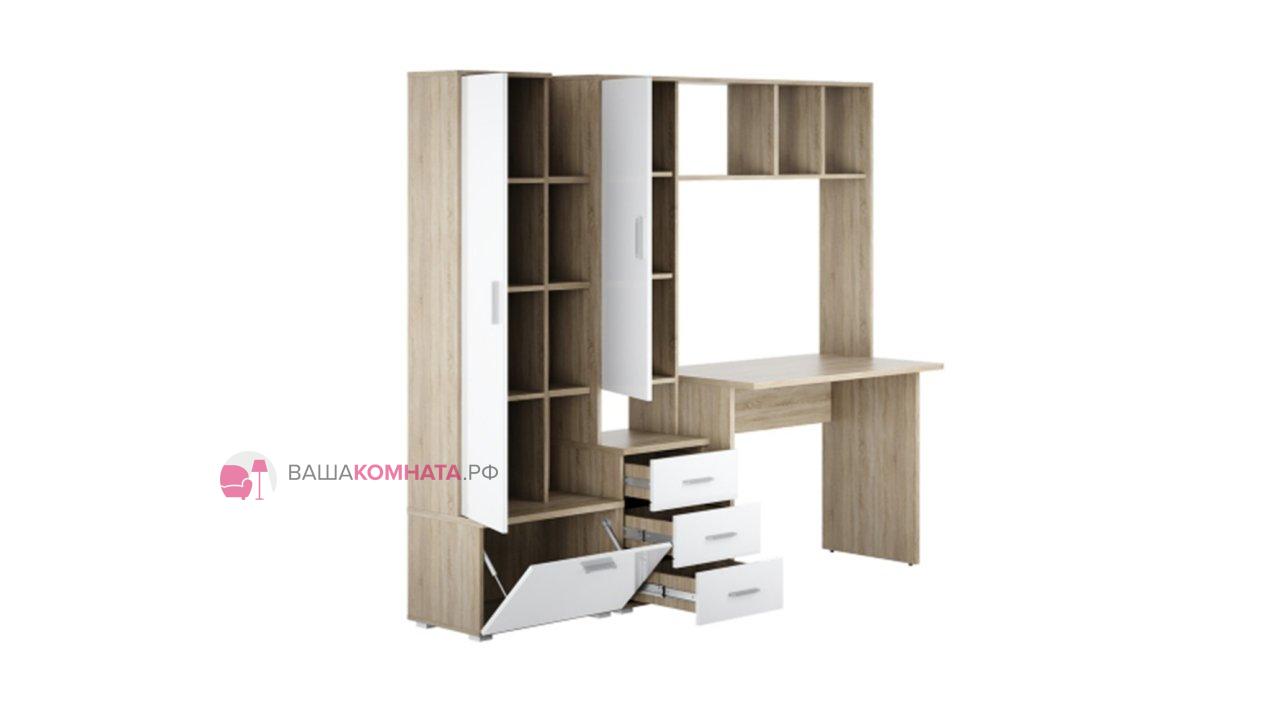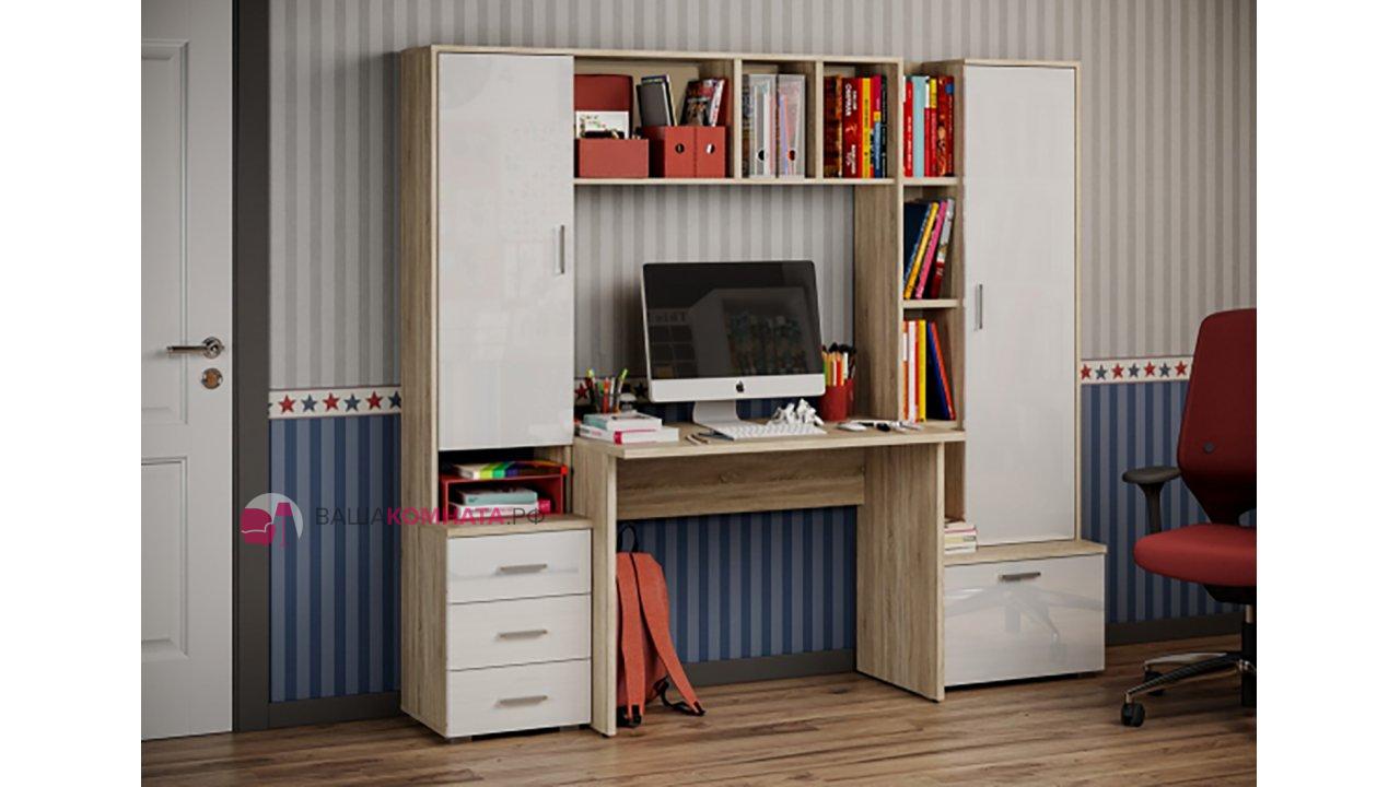 -Рабочий стол размером Д.1000 х В.755 х Г.590 мм. , открытых полок над ним и присоединённого к нему небольшого пенала шириной 400мм. состоящего из тумбы с 3мя выдвижными ящиками и невысокой открытой нишей и закрытым створкой отделением над ней.
